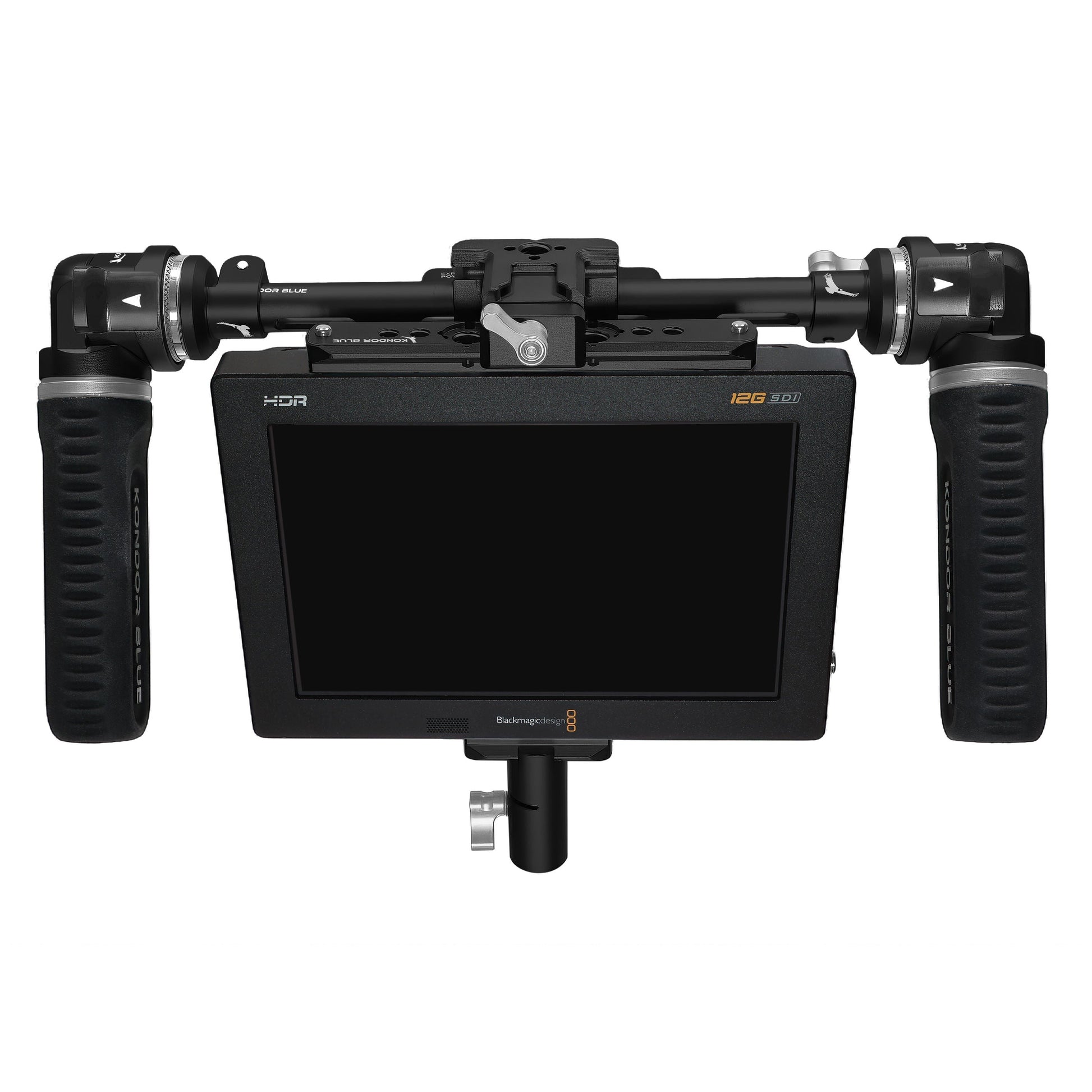 The Director’s Monitor Pro Kit MkII builds upon the foundation of the KONDOR BLUE Director’s Monitor Indie kit. The 5” Monitor Cage Rail can be mounted to the top or bottom of your monitor. Then the Core Bracket can be attached via the NATO clamp. Branching out from the Core Bracket is our 8” PPSH 15mm rod capped with a pair of KONDOR BLUE Pro Pivot Rosette Grips for quick adjustment of grip angles. The 15mm rod mount on the Core Bracket features a unique dual clamping mechanism to prevent the monitor from slipping under its own weight.